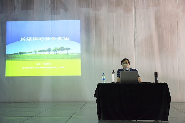 6月28日下午,兰州财经大学商务传媒公司经理杨晓峰教授应邀在信传楼多功能演播厅作了题为《新媒体的社会责任》的学术报告。公司领导、专业师生200余人聆听了报告。