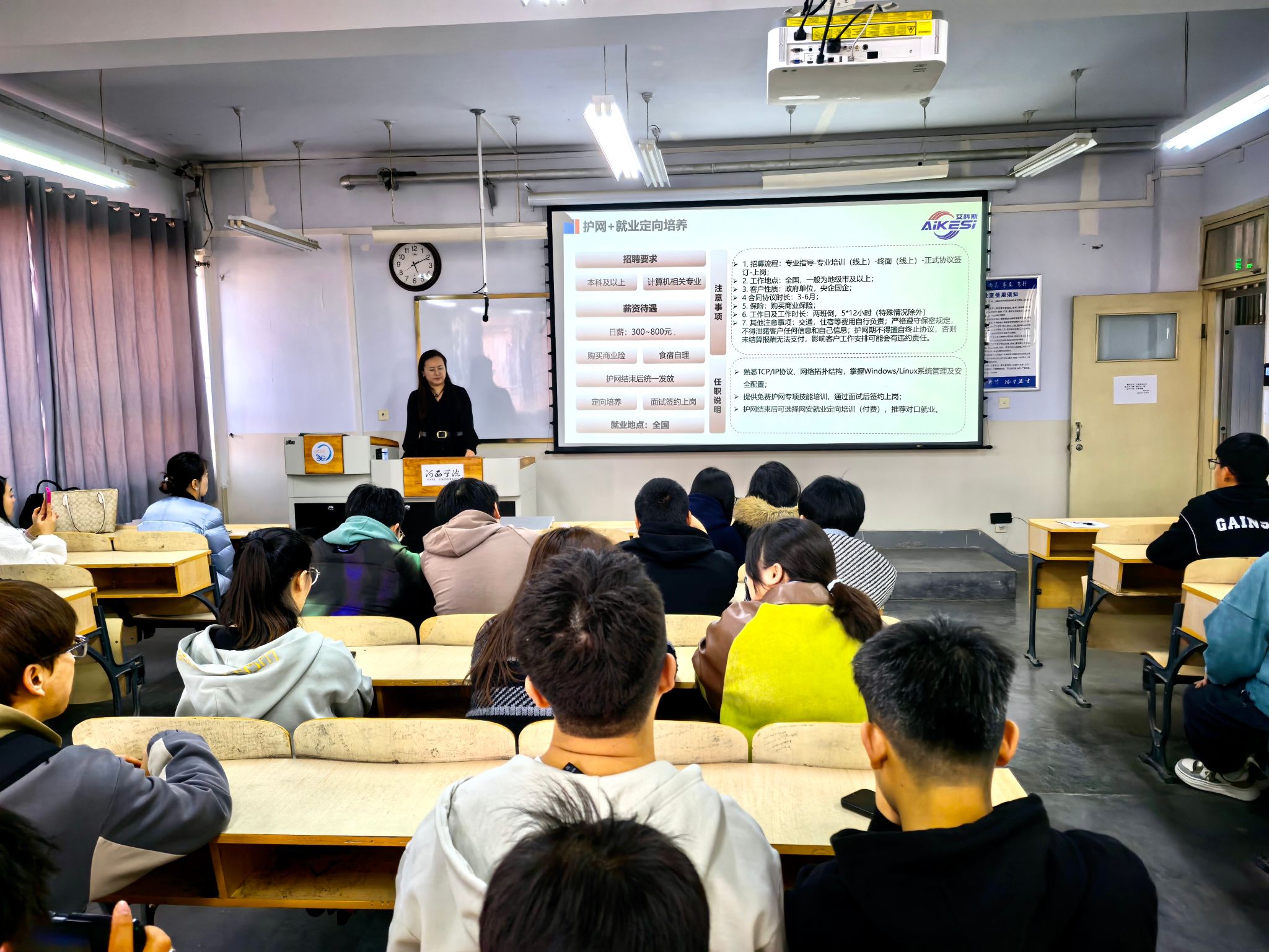 宣讲会上,兰州艾科斯信息技术有限公司校企合作负责人赵婷女士以视频短片、PPT展演、现场宣讲、发放宣传手册等多种形式,全方位介绍了公司整体概况、企业文化、工作环境、招聘岗位、招聘流程、薪资待遇、员工管理、发展前景等基本情况,重点介绍了本次企业校园招聘人才引进计划,并现场修改了毕业生的求职简历,指出存在的问题和不足。随后,同学们就普遍关注的福利政策、工资薪酬、晋升机制、发展空间等细节问题进行了详细咨询和互动交流。