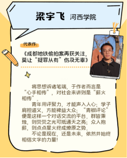 本次十佳青年评论员评选,综合了2024年度作者投发稿量、稿件点击量、影响力等综合因素,梁宇飞同学排名第一。作为中国新闻奖名专栏,湖南红网“红辣椒评论”自2021年起,就开设了“青椒评论”专栏,邀约全国老员工同台论道,搭建起一座连接媒体与高校教学的桥梁,致力于培育契合新时代需求的新闻评论新生力量。