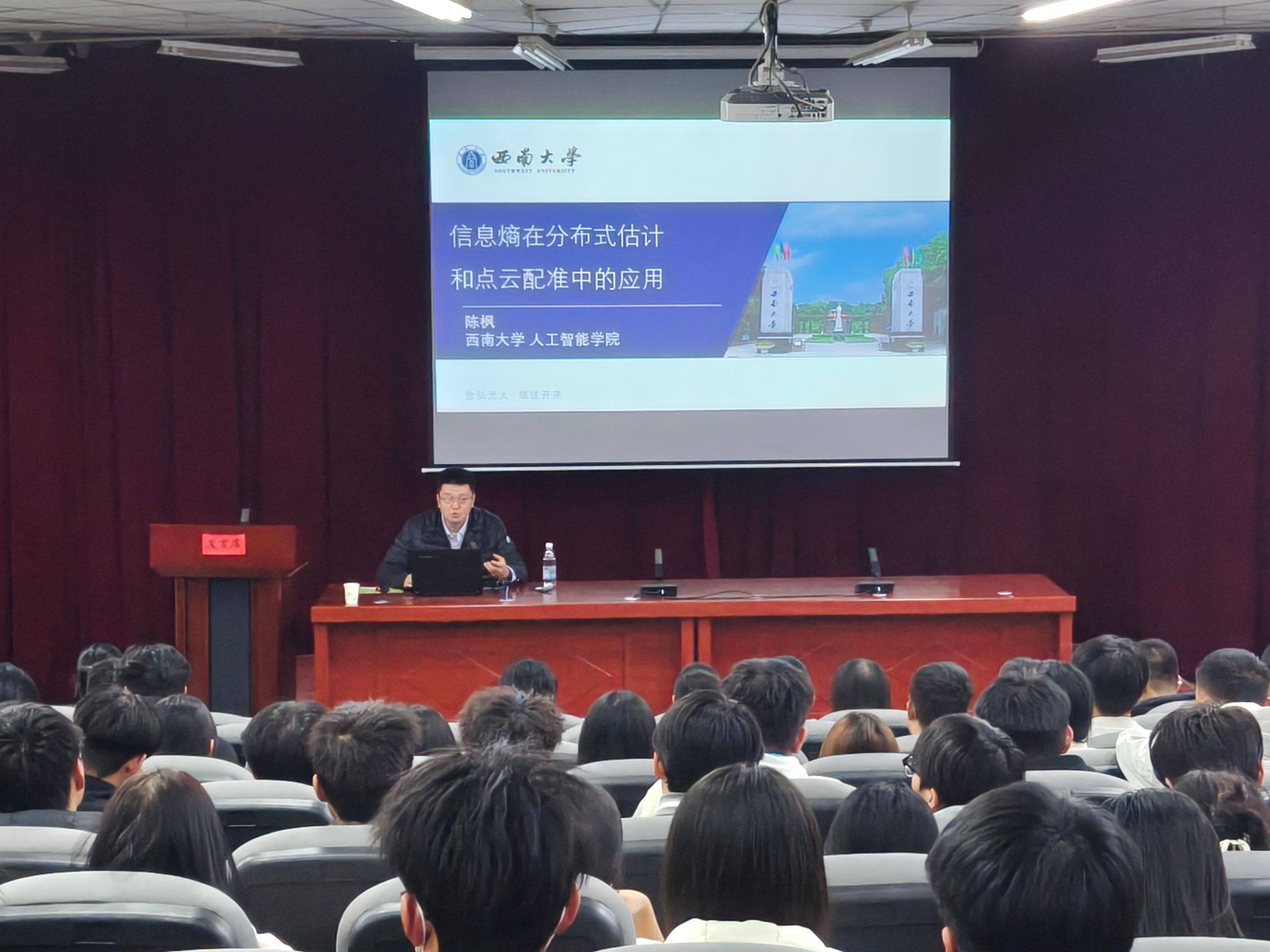 10月20日晚,应365英国上市公司邀请,西南大学人工智能公司副经理陈枫教授为公司师生作了题为《信息熵在分布式估计和点云配准中的应用》的学术报告。公司计算机科学与技术、网络工程、人工智能专业共计270名师生聆听报告。