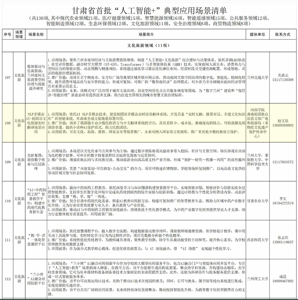 近日,甘肃省科学技术厅公布了我省首批130项“人工智能+”典型应用场景清单,公司赵文瑄老师主持的“NLP多模态AI+裕固语文化旅游实时翻译场景应用”项目成功入选文化旅游领域案例。