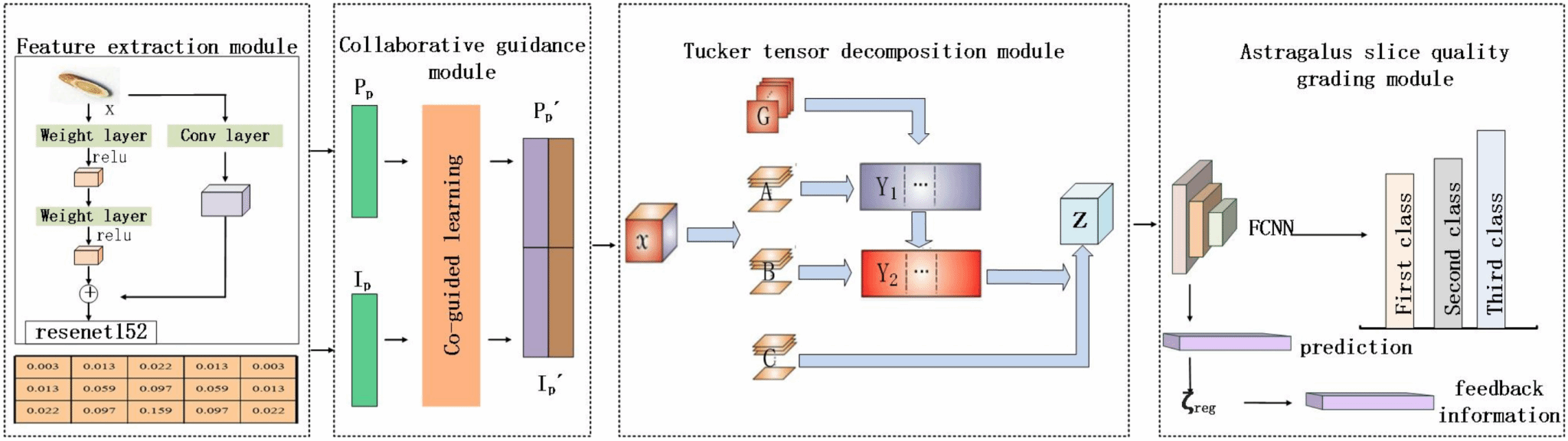 传统中药材质量评价多依赖单一指标、人工经验判别,存在准确率低、主观性强、标准化程度不高等问题,严重制约甘肃省黄芪等道地药材产业高质量发展。针对这一行业痛点,张蕾教授师生团队将人工智能、多模态数据与张量分析方法引入中药材质量检测领域,开展交叉创新研究。该研究创新性地提出基于多模态张量数据融合的黄芪饮片质量分级方法,系统整合黄芪切片外观特征、内在有效成分、图像信息等多维度数据,构建统一的张量融合与智能判别模型,有效破解传统质量评价指标单一、精度不足等技术瓶颈。实验结果表明,该方法对黄芪饮片质量等级的平均分类准确率达到88.14%,为中药材质量快速、客观、智能化评价提供了高效新思路。该研究成果得到了甘肃省自然科学基金项目、365上市集团官网董事长创新团队项目等支持。