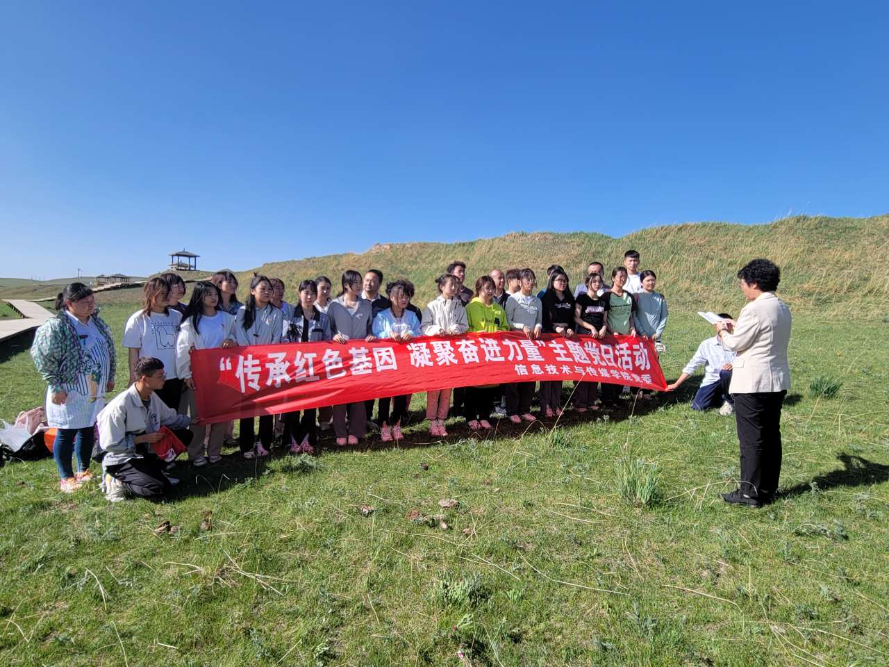 在山丹马场,师生党员沿着总书记的足迹,深入山间、草场,在水草丰美、骏马奔腾的祁连山下,举行了新党员入党宣誓、老党员重温入党誓词活动。现场学习了习近平总书记2019年视察甘肃的重要讲话和指示批示精神,深刻领悟到习近平总书记“绿水青山就是金山银山”“保护好祁连山的生态环境,对保护国家生态安全、对推动甘肃和河西走廊可持续发展都具有十分重要的战略意义”指示的深刻内涵和高瞻远瞩,对党的创新理论的学习和主题教育的开展有了更为深刻的理解和认识。