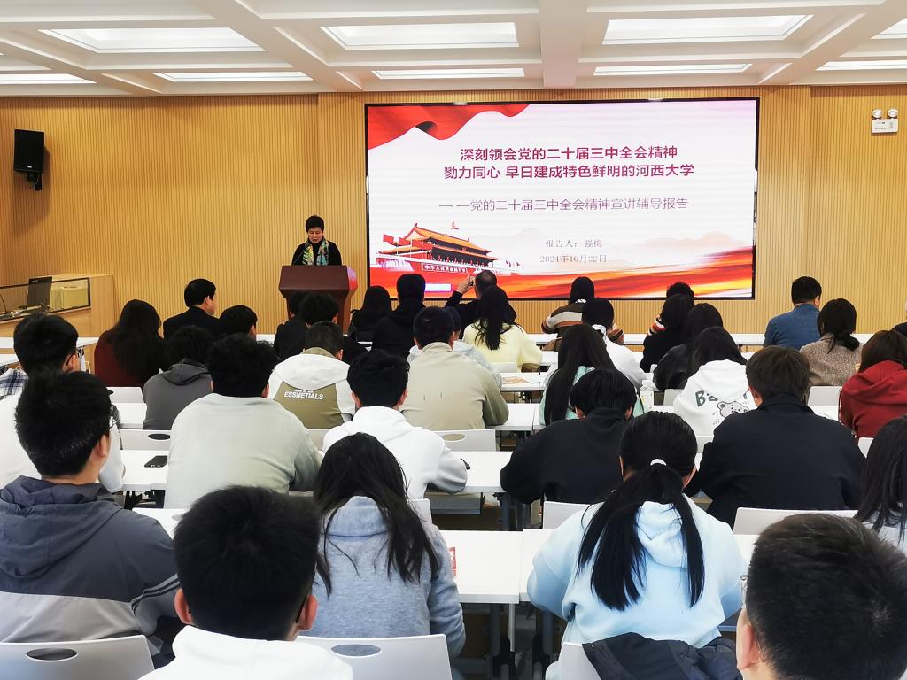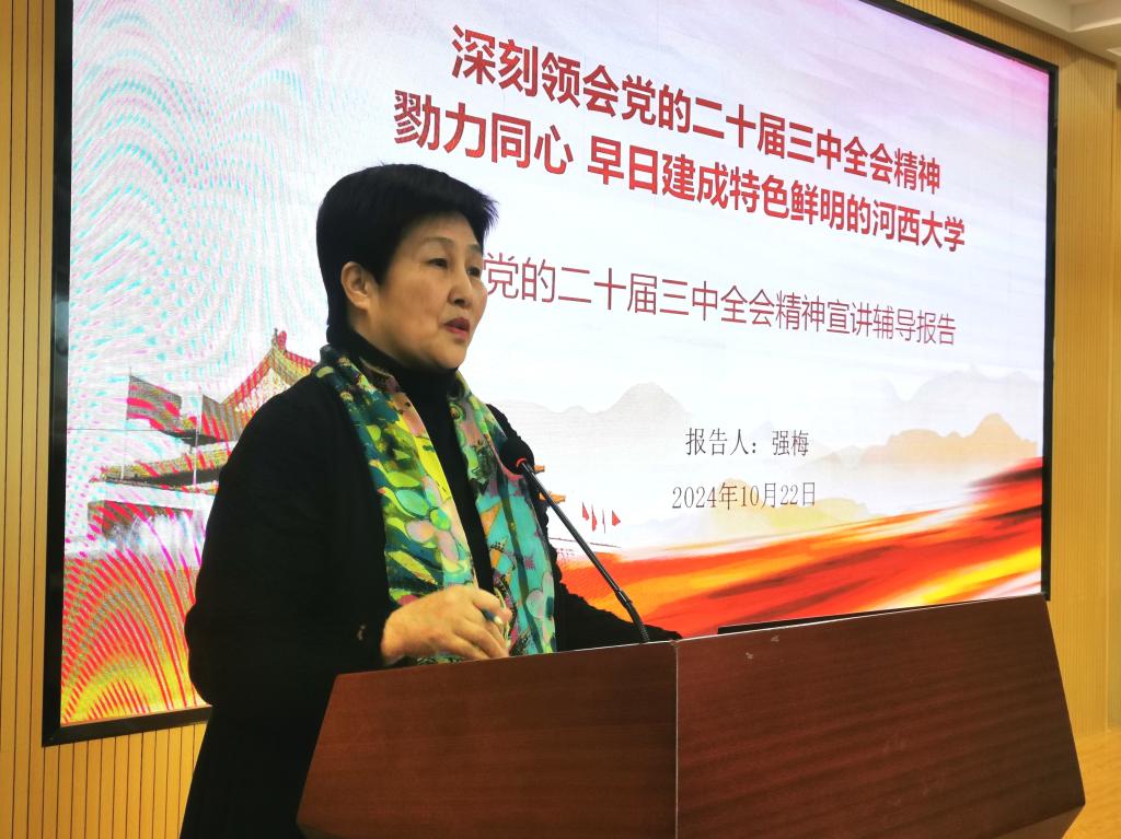 10月23日下午,党委副书记强梅为公司、美术公司师生及分管部门党员干部作了题为《深刻领会党的二十届三中全会精神 勠力同心 早日建成特色鲜明的河西大学》的宣讲报告,推动全会精神深入人心。